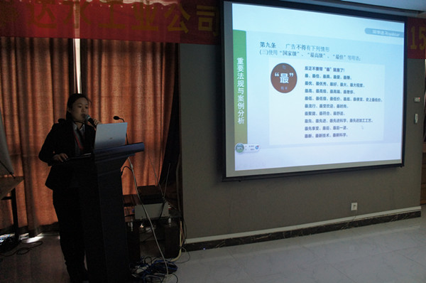 會上,公司企劃總監劉海燕將廣告法條例與公司企宣工作案例相結合,用精心準備的PPT具體詳細地講解了新法實施后企業宣傳中需要整改和注意的要點。從極限詞的禁用到產品代言新規定;從產品外包裝規范到市場活動宣傳注意事項;從企業印刷物料整改到線上線下統一規范,劉總在會上明確要求各部門在實際工作中必須堅決貫徹“從嚴”的原則,認識上從嚴,執行上從嚴,監督上從嚴。