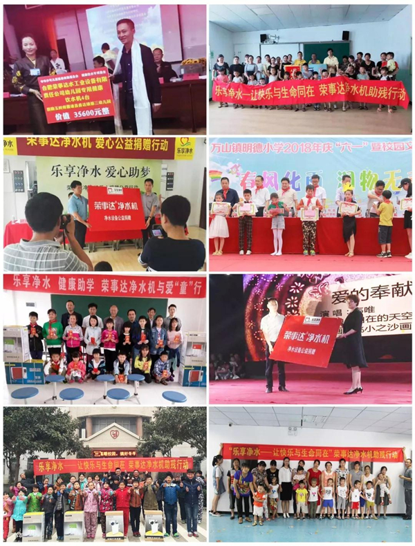早在2011年,榮事達就面向全國開展“樂享凈水?健康助學行動”,截至目前已向安徽、江蘇、陜西、江西、河南、河北等多個地區(qū)的學校捐贈凈水設(shè)備數(shù)千套。2016年,榮事達走進紅色革命老區(qū)金寨縣,向全國首個希望小學——金寨希望小學捐贈了直飲水設(shè)備,兩千多名師生因此喝上了健康直飲水。之后,榮事達聯(lián)合金寨希望公益服務中心及地方公益協(xié)會共同發(fā)起“給山區(qū)孩子一杯水”——援建金寨中小學凈水設(shè)備公益活動,榮事達援建400多套直飲水設(shè)備,幫助全縣的學校解決了飲水難題。該公益項目引發(fā)了社會各界熱烈關(guān)注,被評為“安徽省十佳學雷鋒志愿服務項目優(yōu)秀典型”。立責于心,健康助學,在公益這條路上,榮事達未來將繼續(xù)推進,為更多校園送去安全水,盡心呵護孩子們健康成長。