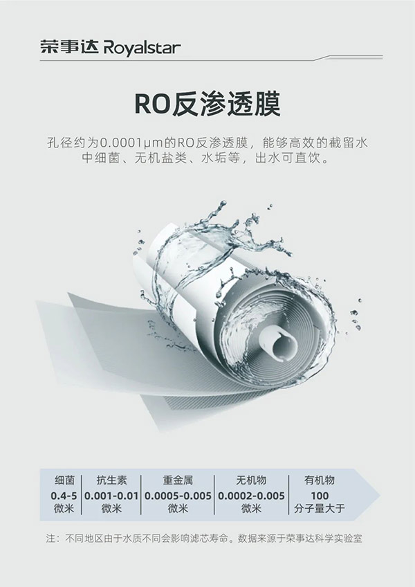 產(chǎn)品采用RO反滲透技術(shù)和五級過濾系統(tǒng),PP棉有效濾除原水中的鐵銹、泥沙等顆粒物;壓鑄活性炭濾芯吸附凈化,有效濾除余氯及異色異味;RO反滲透膜有效濾除水堿水垢及重金屬微生物;后置活性炭改善口感、出水甘冽。完美解決學(xué)校飲水各項難題,滿足師生健康飲水需求。